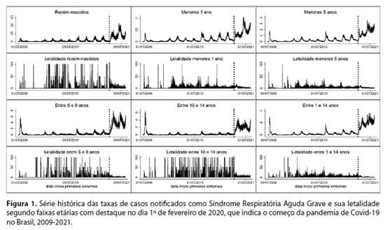 RESULTADOS: Menores de cinco anos de idade apresentaram maior taxa e percentual de casos. Na categoria anos pandêmicos, pré-escolares apresentaram maiores percentuais de casos notificados e recém-nascidos os maiores percentuais de letalidade; enquanto no período não pandêmico, foi lactente pós-neonatal com maior percentual de casos e adolescente com maior letalidade. Tanto Região Sudeste quanto Nordeste evidenciaram aumento progressivo de percentuais durante o estudo. As taxas em todas as faixas etárias analisadas apresentaram-se elevadas e em ascensão a partir de fevereiro de 2020, com destaque para as duas ondas de Covid-19, enquanto a letalidade permaneceu reduzida.