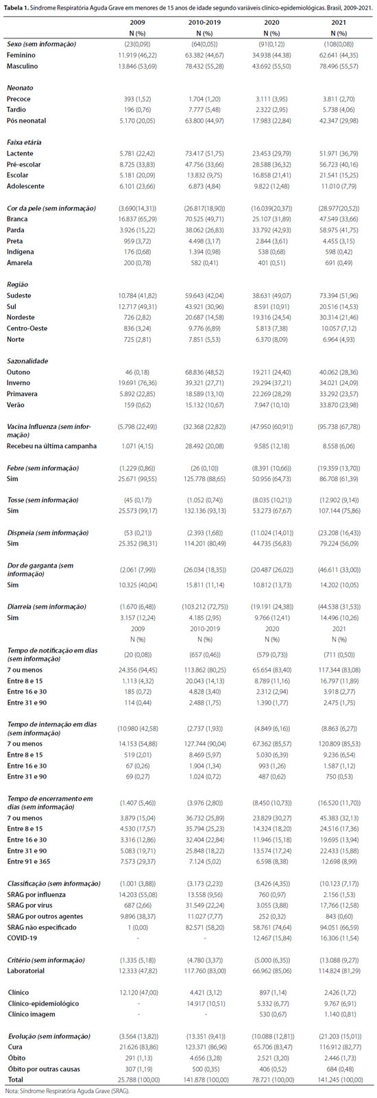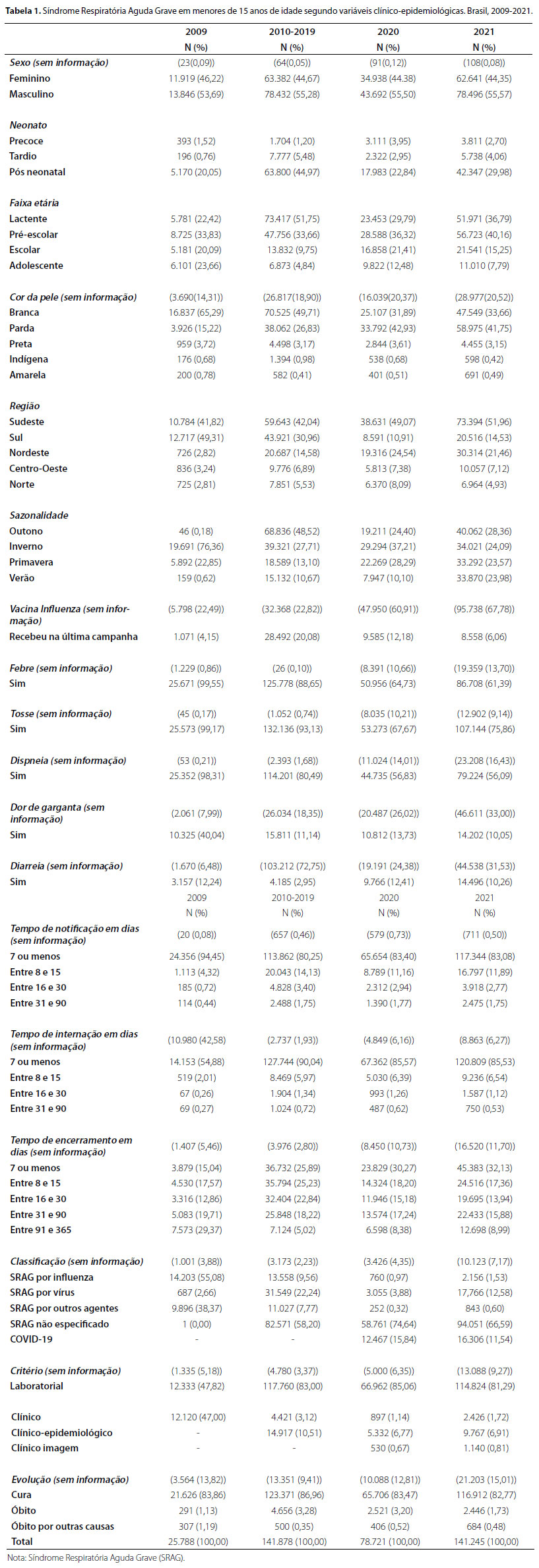 OBJECTIVE: To analyze historical series and clinical-epidemiological variables of cases reported as Severe Acute Respiratory Syndrome (SARS) in Brazilians under 15 years of age from 2009 to 2021.