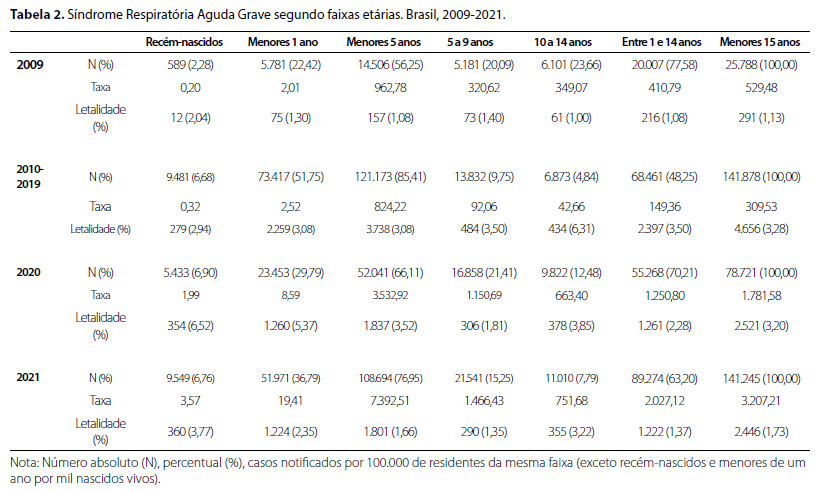 Menores de 15 anos de idade representaram 11,75% das FN-SRAGs entre 2009 e 2021 no Brasil. A população menor de cinco anos de idade constituiu os maiores percentuais e taxas de casos notificados como SRAG no período estudado. Na categoria anos pandêmicos, pré-escolares apresentaram maiores percentuais de casos notificados e recém-nascidos os maiores percentuais de letalidade; enquanto no período não pandêmico, foi lactente pós-neonatal com maior percentual de casos e adolescente com maior letalidade. Em 2009, a Região Sul e o inverno apresentaram protagonismo. Após, Sudeste e outono. As taxas foram elevadas e ascendentes em todas as faixas etárias a partir de fevereiro de 2020 até o final de 2021, com destaque para dois picos nos primeiros semestres destes anos.
