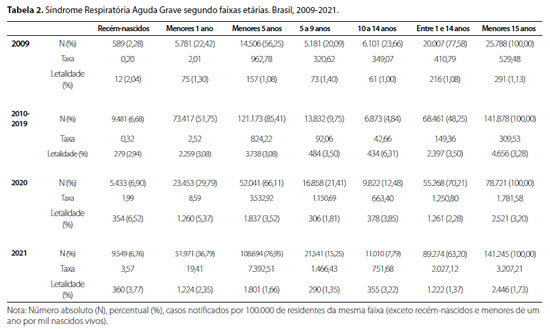 No ano seguinte, todas as faixas etárias aumentaram suas taxas, mas não foi acompanhado pelo aumento em porcentagem para menores de um ano e menores de cinco anos. Em 2021, escolares, adolescentes e recém-nascidos reduziram percentual de FN-SRAGs, enquanto menores de um ano de idade aumentaram em comparação ao ano anterior. Quanto à taxa, adolescentes e menores de 15 anos de idade reduziram (66,34/100.000 para 7,52/100.000; e 178,16/100.000 para 32,07/100.000) em comparação ao ano de 2020.